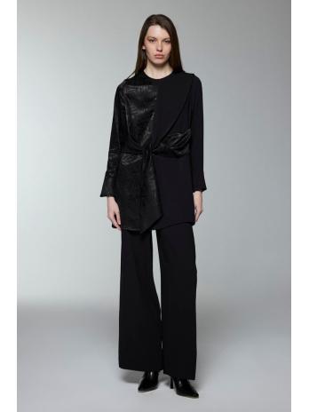 Ce modèle de costume, qui attire l’attention par sa texture moderne et sa coupe élégante, met en valeur l’élégance grâce à ses transitions asymétriques de motifs et ses détails de ceinture à la taille. Il offre du confort grâce à son pantalon à jambes larges, tandis que le détail des manches à volants sur le haut ajoute une touche sophistiquée au design.